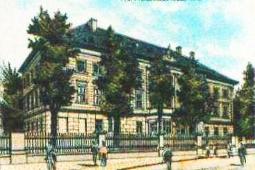 Portret Zygmunta Steinberta i widoki obiektów szkolnych ze starych kart pocztowych z kolekcji pana Franciszka Kułagi.